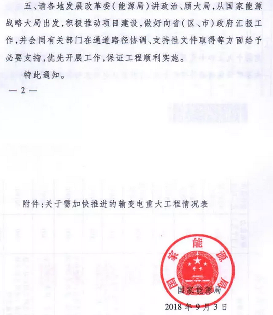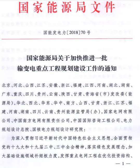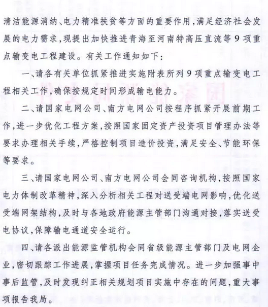 9月7日获悉,国家能源局印发《关于加快推进一批输变电重点工程规划建设工作的通知》国能发电力〔2018〕70号,《通知》指出,为加大基础设施领域补短板力度,发挥重点电网工程在优化投资结构、清洁能源消纳、电力精准扶贫等方面的重要作用,加快推进青海至河南特高压直流、白鹤滩至江苏、白鹤滩至浙江特高压直流等9项重点输变电工程建设,合计输电能力5700万千瓦(工程见附件)。