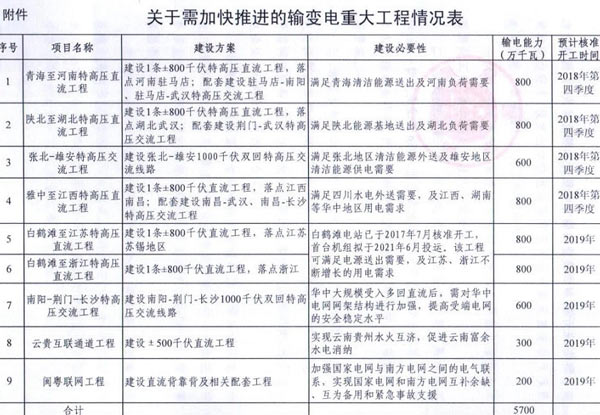 9月7日获悉,国家能源局印发《关于加快推进一批输变电重点工程规划建设工作的通知》国能发电力〔2018〕70号,《通知》指出,为加大基础设施领域补短板力度,发挥重点电网工程在优化投资结构、清洁能源消纳、电力精准扶贫等方面的重要作用,加快推进青海至河南特高压直流、白鹤滩至江苏、白鹤滩至浙江特高压直流等9项重点输变电工程建设,合计输电能力5700万千瓦(工程见附件)。