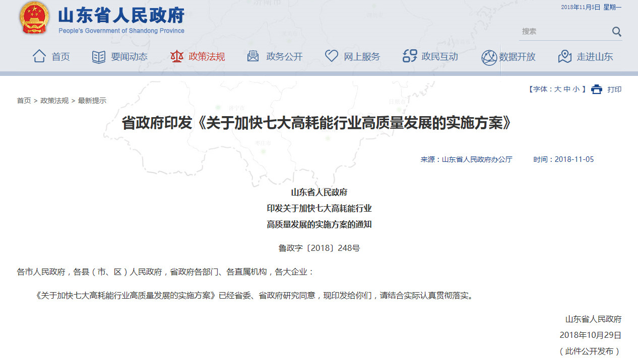 近日山东省人民政府印发《关于加快七大高耗能行业高质量发展的实施方案的通知》,