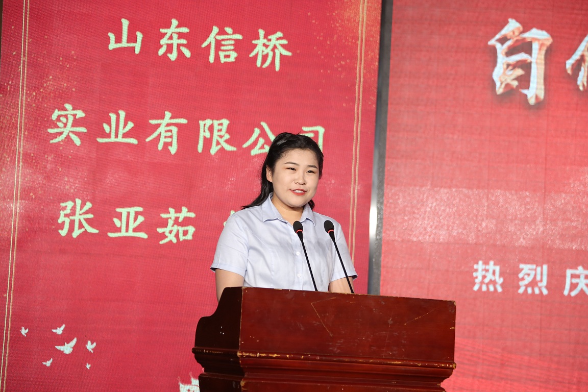 员工代表张亚茹讲话,她是青年一代的代表,代表了从校园进信桥的一代,感慨了信桥二十几年的发展,感谢信桥给予她的财富和能力。