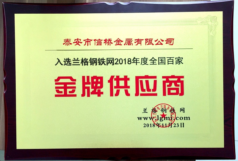会议过后后,是众多钢企,钢贸商期待的颁奖环节,泰安市信桥金属有限公司再获殊荣,荣获兰格网“2018年度全国百家金牌供应商称号”。颁奖现场热闹非凡,参会人员倍感荣幸。
